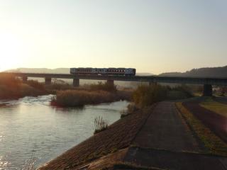 立会川のほとりを遊歩道が続いています。丁度、電車がガタゴト…。