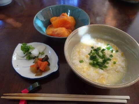その前の晩にお鍋にしてお出しが残ったので、それを雑炊に。