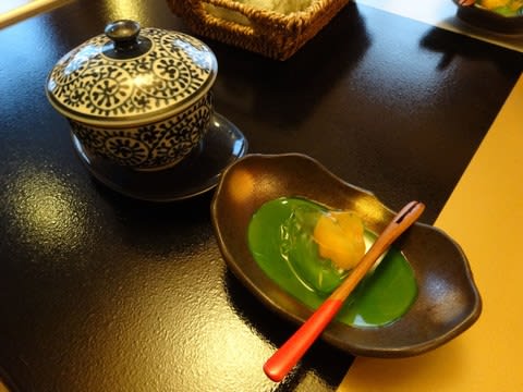 部屋に通され、琵琶のゼリーとお茶のおもてなし