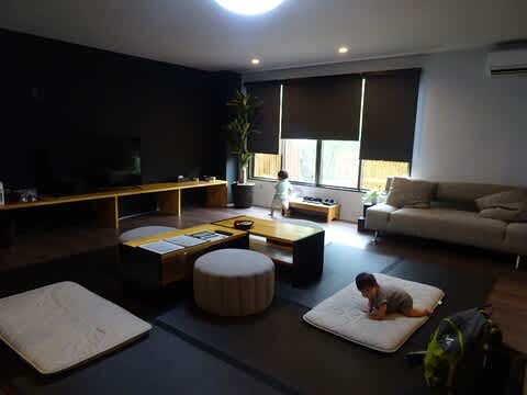 娘が下の孫に授乳の間、上の孫とトランポリンや平均台で遊んだり、