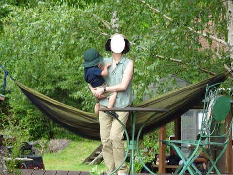 ハンモックも乗ってみたいというから乗せようとしたら、怖がってダメでした。