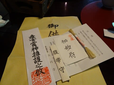 このようにお守りを頂いて、腹帯にはおしるしを頂きました。
