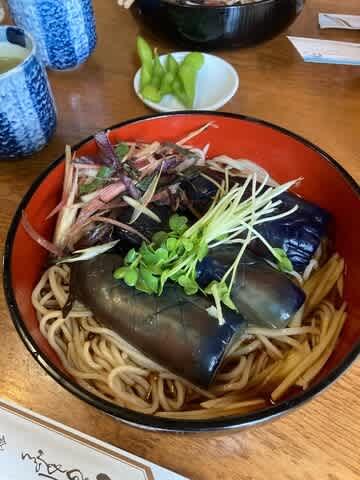 精進蕎麦を注文しましたが、大きな素揚げナスが入っていて、びっくり。