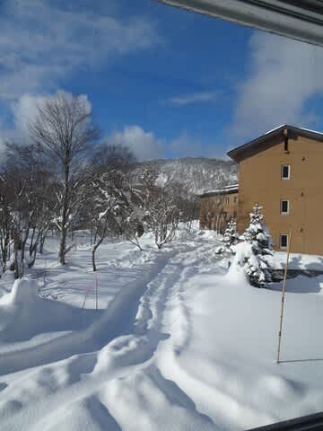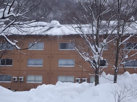 あ。あの3Fのカーテンの開いている部屋が私たちのお部屋です。