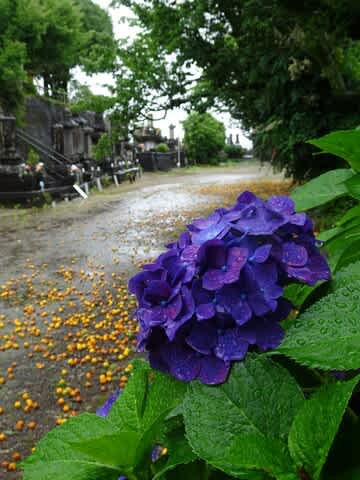 法事が行われたお寺では、紫陽花が。その奥には梅の実がたくさん落ちていましたが、