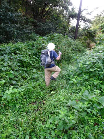 朝露に濡れた道で、靴もズボンもびっしょりです
