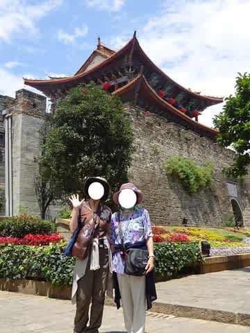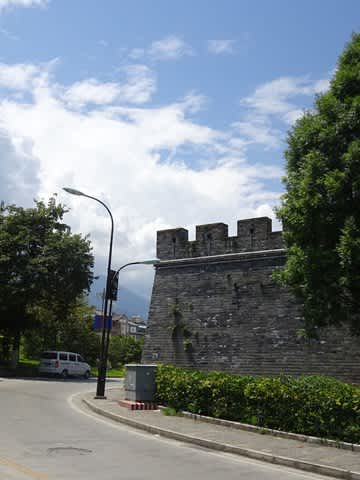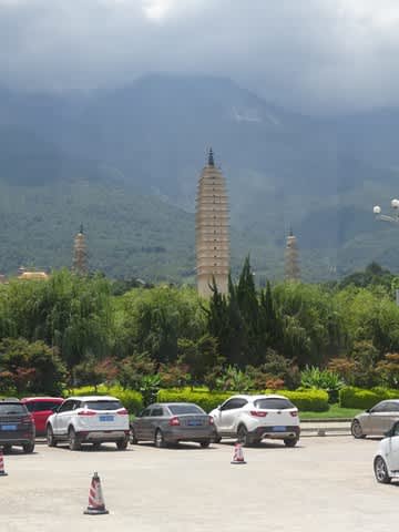 大理のシンボル崇聖寺三塔は車窓から眺めて、大理古城の城壁が見えて来ました。