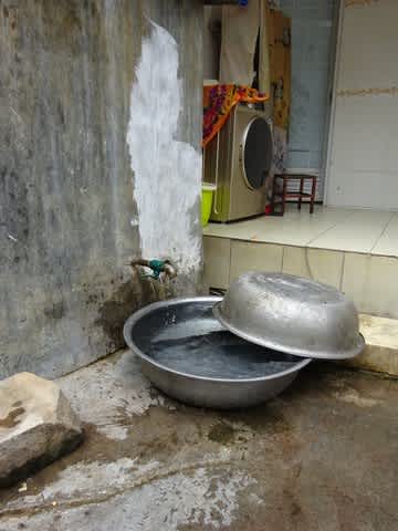 隅にあったタライの中にお魚が泳いでいます。今晩のおかずかな?