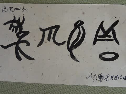 これは、ナシ族の文字、トンパ文字で書いた私の名前と「上善如水」。