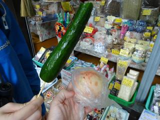 あ、これはそばのお店で買ったきゅうりの一本漬けと桃。