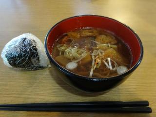 持参したおにぎりと、あったかいけんちん汁。山小屋のそばに可愛いお花が咲いていました。