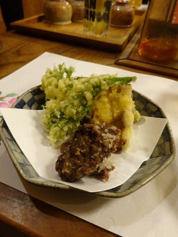 茶色の天ぷらは、むかごの天ぷらです。これ、美味しいの~
