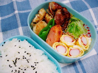 黄色と赤ってすっごく色が鮮やかなんだよね。ぱ~っと明るくなるって言うか。なんでぇ?ぽよぽよんさんだって、きれいにお弁当作ってるじゃない?品数だって多いしさ。