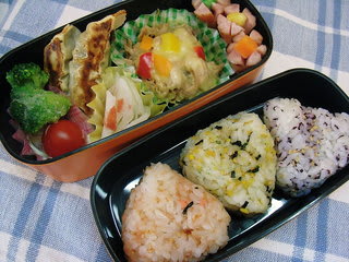 おかずがいっぱい、おにぎりも色とりどりで豪華なお弁当だと思います。野菜がいっぱい入って栄養満点ですね。