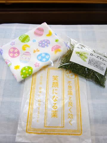 ご自宅で採れたローズマリーと、ガーゼハンカチを縫ったんですって。