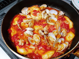 かじきマグロを塩コショウして、小麦粉をはたいて両面焼付け、そこへトマトソース・ワイン投入。コンソメスープとバジル・オレガノ塩コショウで味を整え、アサリ投入。ふたをしてしばらく煮たら完成!です