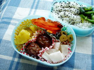 そんなことで、昨日のお弁当は、前の晩にパーティーのために作っておいた料理も入ってます。
