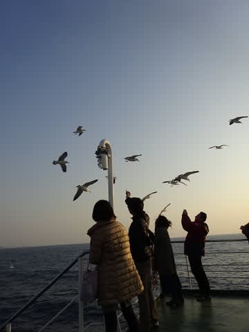 カモメにエサを上げる人がいて、カモメがずーっと着いてきます。久里浜まで着いてくるのかしら…