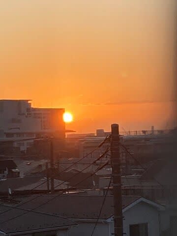 真っ赤に広がる空とお日さまに照らされてウォーキング。と…。