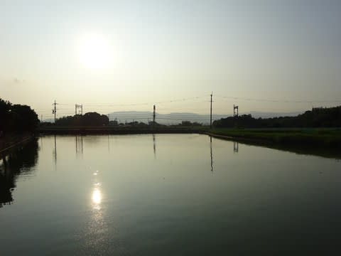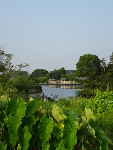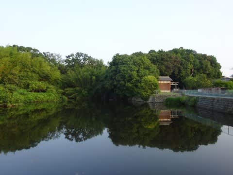 神社のほとりの池も綺麗です。今日も良いお天気になりそうだなぁ。
