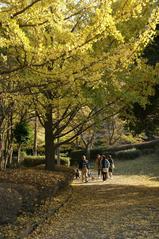 銀杏並みが美しい・・・。仲良し家族がわんちゃん連れてお散歩。