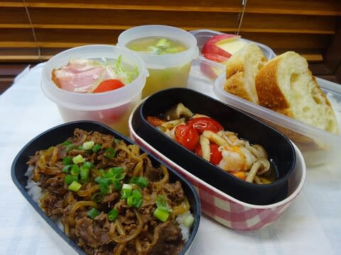 牛丼とアヒージョのお弁当と、アヒージョソ―スとアンチョビペースト