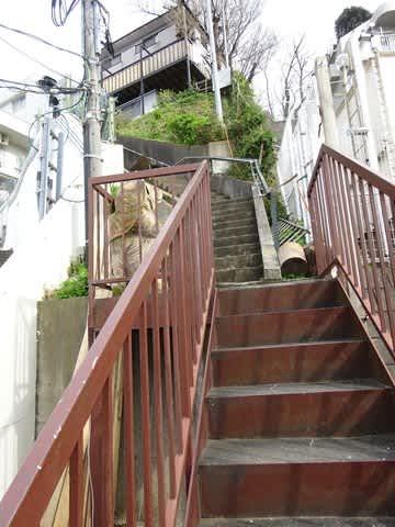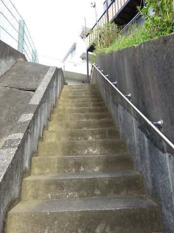 住宅地に見つけた看板。そしてその先には、長い階段。