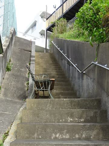 途中休憩用のベンチまであります。…まだまだ続く階段。