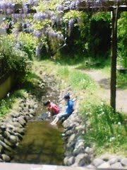 公園入り口の小川で遊ぶ子ども達