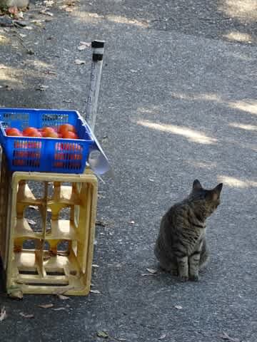 無人の柿販売所の前に可愛いにゃん、発見