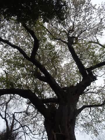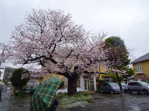 これは樹齢600年の桜の大木なんですよ。桜のお花満開なのに、あいにくのお天気で悲しい