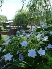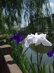 紫陽花と、あやめの美しい水辺の道。