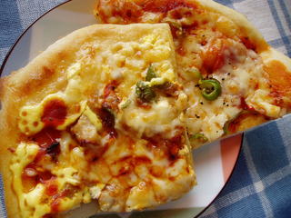 うっかり、切ってしまってからカメラとるの忘れてたことに気づいたので、カットしたピザ。上が鶏チャーシュー、下がベーコンのピザです。