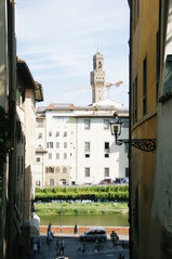 建物の間から見えるヴェッキオ宮とアルノ川・・・。