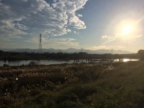 暫く歩くと烏川の土手道へ。橋を渡って、さらに反対側の川の土手にあるサイクリングロードをまっすぐ歩きます。