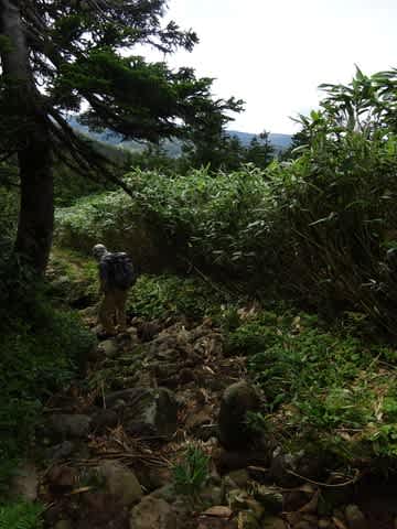 でもここを過ぎると、ガレガレ。岩や石、しかも苔付き。 倒木も有りで。
