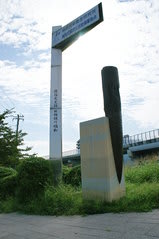 逆光で見えにくいですが、昔の相模川(馬入川)の橋の脚をモニュメントにした記念碑です。