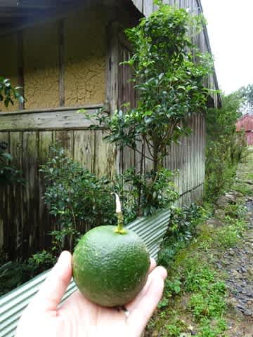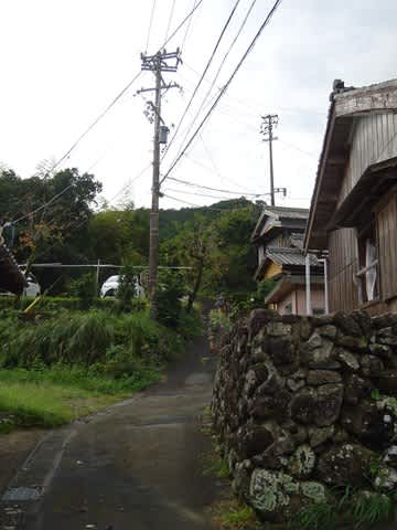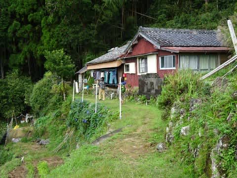 山道を抜けると、民家があって、自宅の修理をしている人が。