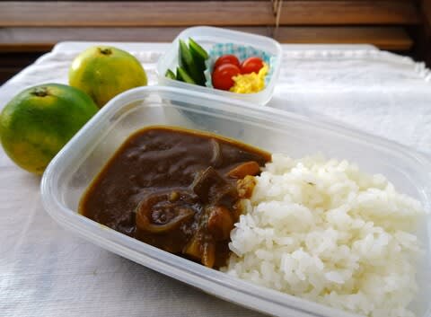 シーフードカレーのお弁当と、朝の景色とネコのはーちゃん