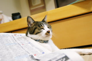 お気に入りの新聞紙の中で「ムー・・・満足じゃ」のはーちゃん。