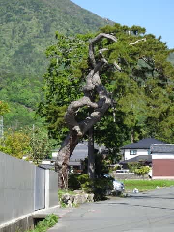 可愛らしいこいのぼりと、曲がりくねった松の木
