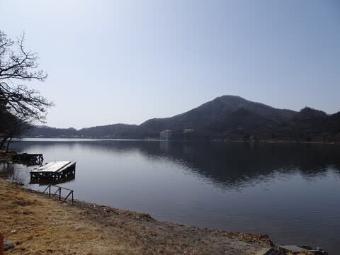 バス停から登山口まで湖沿いを歩き、登山開始です