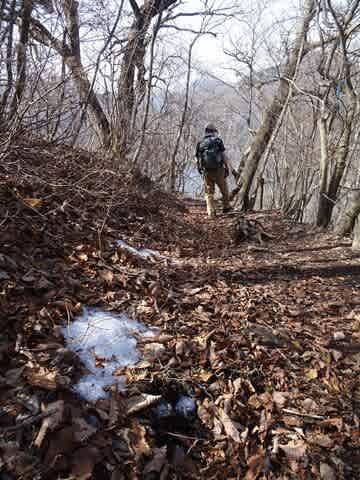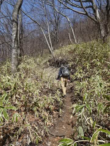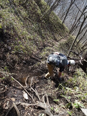 北斜面だからほんの少し雪が残っているなぁと思ったら、登山道はドロドロで滑る滑る。