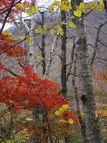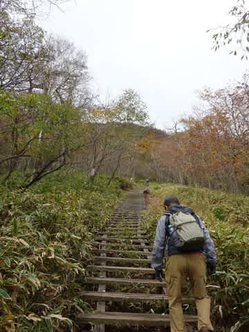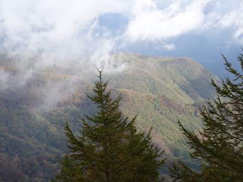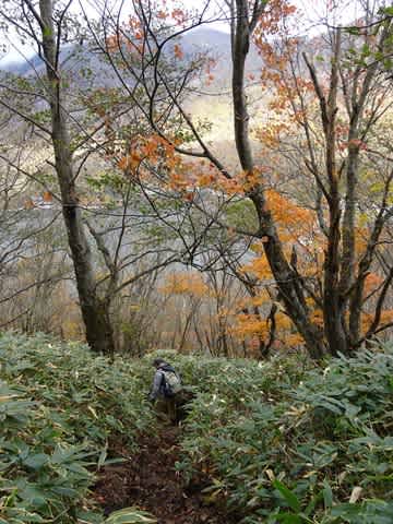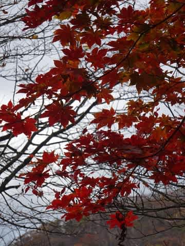 美しい紅葉の中を歩きます。でも山頂に近づくと、次第に雲が…。