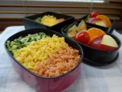 おはようございます今日も良いお天気今日のお弁当・三色丼   鮭 たまご きゅうり糠漬け・鮭味噌カボスソテー・ミニトマト・空芯菜おひたし・みかん・りんご今日は食材、お肉もツナもなくって、メインとなりそうなのは、冷蔵庫には鮭が一切れのみ…。でも...