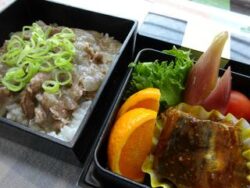 山椒塩牛丼のお弁当と、豚カレー炒めのお弁当と、お手紙