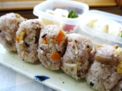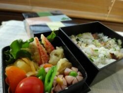 たけのこご飯おにぎりのお弁当と、木のぬくもり