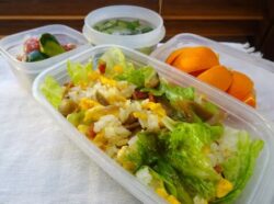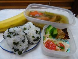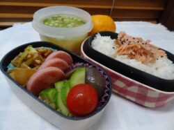 おはようございます2025.4.3(木)のお弁当・鰯のつみれ汁・スクランブルエッグ・春菊の白和え・スナップエンドウ・トマト・玄米ご飯 じゃこ 黒ゴマ・野菜ジュース バナナ スナップエンドウ にんじん トマト ヒハツ リンゴ酢スーパーで鰯が激...