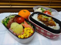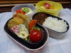 おはようございます皆さん、昨晩見ましたかー!?アレ今日のお弁当・ちょい足しカレーライス・ボローニャソーセージフライ・スパサラ・きゅうり・ミニトマト・煮物 里芋 ごぼう こんにゃく にんじん・玉ねぎ+豆腐+トマトサラダ・りんご実は昨日もお弁...