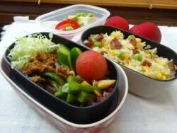 おはようございますな…なんと今日は晴れていますよっ今日のお弁当・ミートカレーライス  豚挽き 牛挽き じゃがいも セロリ 玉ねぎ にんじん ナス トマト・きゅうり漬・玉ねぎ+豆腐+トマトサラダ・サラダ  千切りキャベツ セロリ レタス トマ...